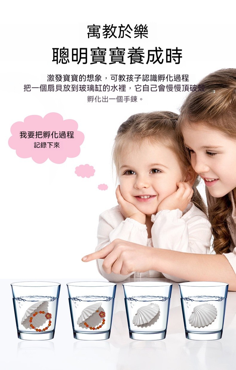 這款 【泡水孵化美人魚貝殼】 ,讓孩子親眼見證海洋奇蹟!✅ 泡水孵化|神奇生長 把小貝殼放進水裡,靜靜等待,就會「孵出」驚喜小寶石或神秘小動物~超神奇!✅ 海洋盲盒|驚喜滿滿 每顆貝殼裡面都藏著不同的驚喜,打開前永遠不知道會得到什麼,像開盲盒一樣刺激!